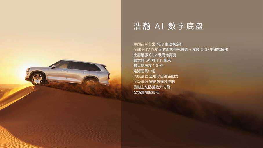 底盘技术方面,极氪9X首发搭载浩瀚AI数字底盘,集成闭式双腔空气悬架、双阀CCD电磁减振器及48伏主动稳定杆技术,实现0.2秒内80毫米举升,动态侧倾接近“零侧倾”。该系统首次将AI算力引入底盘域,通过定海智能中枢实现姿态控制从“事后跟随”到“提前预判”的进化,即使在120公里/小时高速湿滑路面双轮爆胎,仍能稳稳刹停。越野场景下,系统可自动识别深雪、泥地等7种地形并匹配专属驾驶模式。