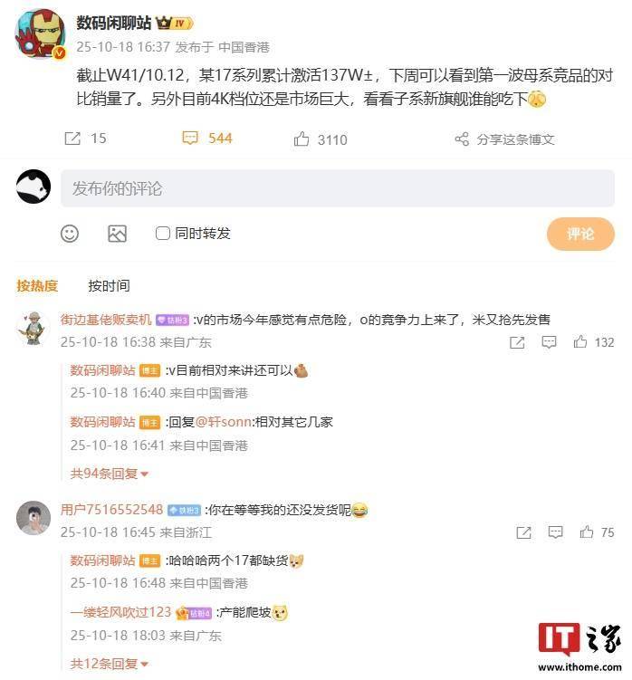 近日,数码领域传来关于小米17系列手机的最新销售动态。据知名博主@数码闲聊站披露,截至10月12日,某17系列手机(结合评论推测为小米17系列)累计激活量已达137万台左右,预计下周将公布该系列与竞品的第一波销量对比数据。博主同时指出,4000元价位段手机市场潜力巨大,各品牌子系列旗舰机型将在此展开激烈竞争。