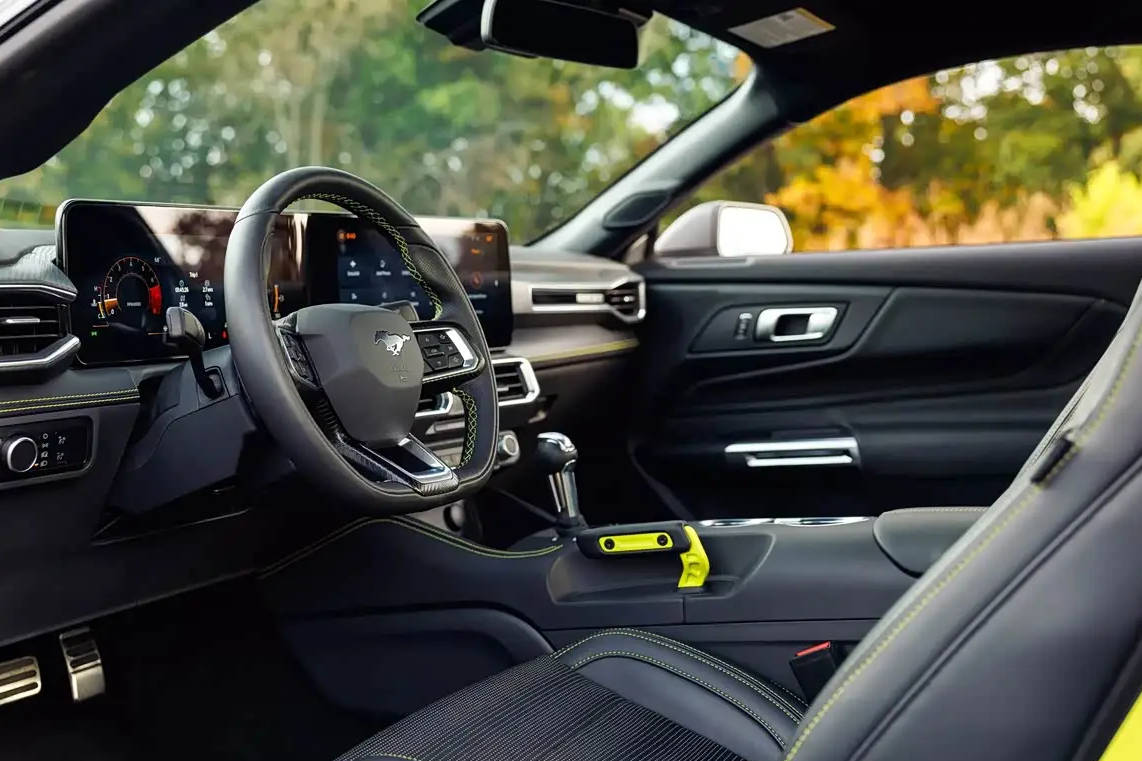 在外观设计上,RTR套件融入了诸多标志性运动元素与专属标识。新车配备了RTR发光格栅,夜间点亮后极具辨识度。运动前保险杠与性能后扰流板源自Mustang GT,进一步强化了空气动力学表现。车身侧面,19英寸RTR专属轮毂搭配叶子板处的RTR徽标,可选装的个性化拉花与荧光绿色Brembo制动卡钳形成鲜明对比,尽显赛道气息。用户还可选择Hyper Lime外观包,将刹车卡钳与车身饰条升级为荧光绿配色,彰显专属身份。