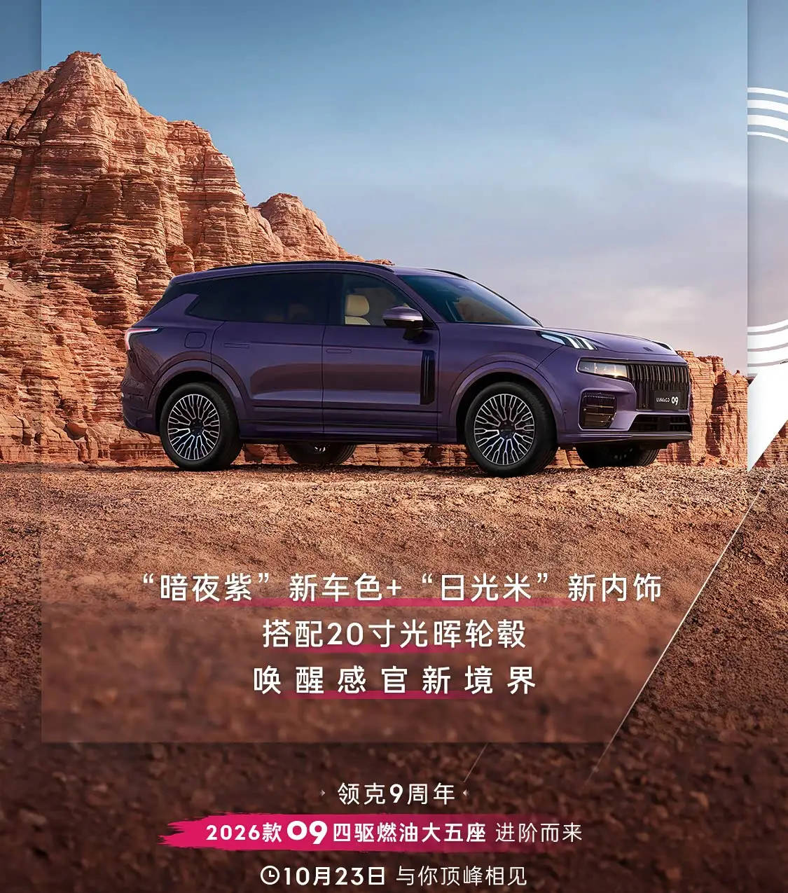 领克09 MHEV四驱探索版10月23日上市,暗夜紫车色与日光米内饰成亮点