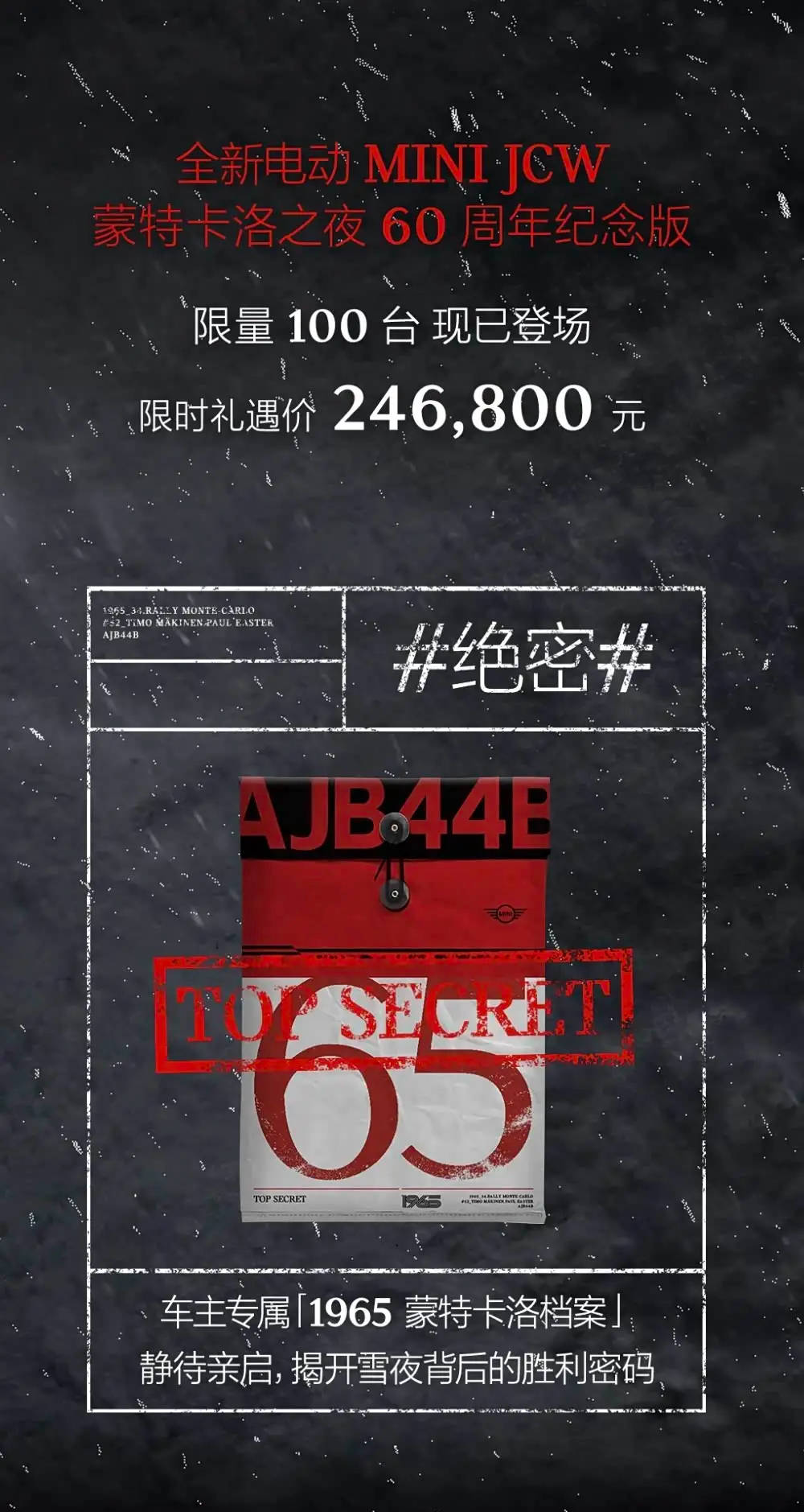为致敬1965年蒙特卡洛拉力赛的传奇时刻,电动MINI JCW推出蒙特卡洛之夜60周年纪念版车型,全球限量100台,限时礼遇价24.68万元。该车提供0首付购车方案,年利率最低4.28%,以纪念当年传奇车手蒂莫·马基宁(Timo Mäkinen)与领航员保罗·伊斯特(Paul Easter)驾驶52号MINI Cooper S,在暴风雪封锁的夜间赛段逆袭大排量对手的壮举。