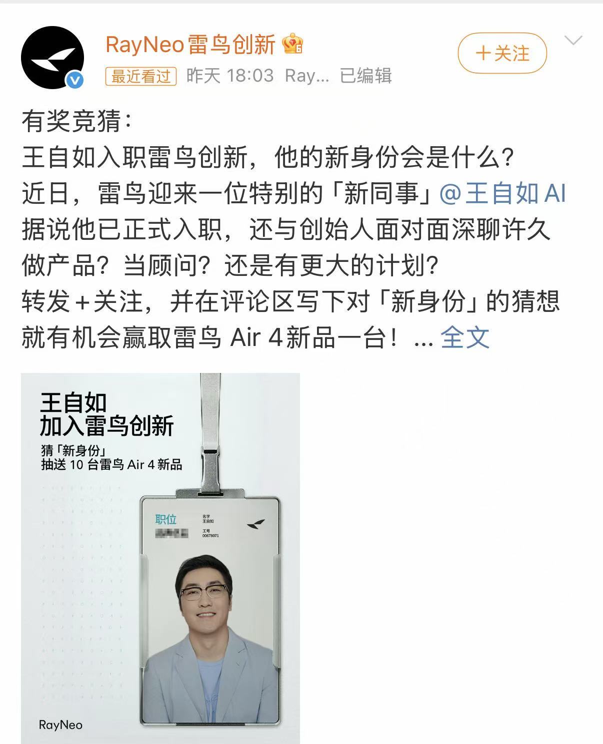 近日,AR领域知名品牌雷鸟创新通过官方渠道对外宣布,知名数码领域人物王自如已正式加入公司团队,并展示了其工作证件,但未具体说明其担任的职务。