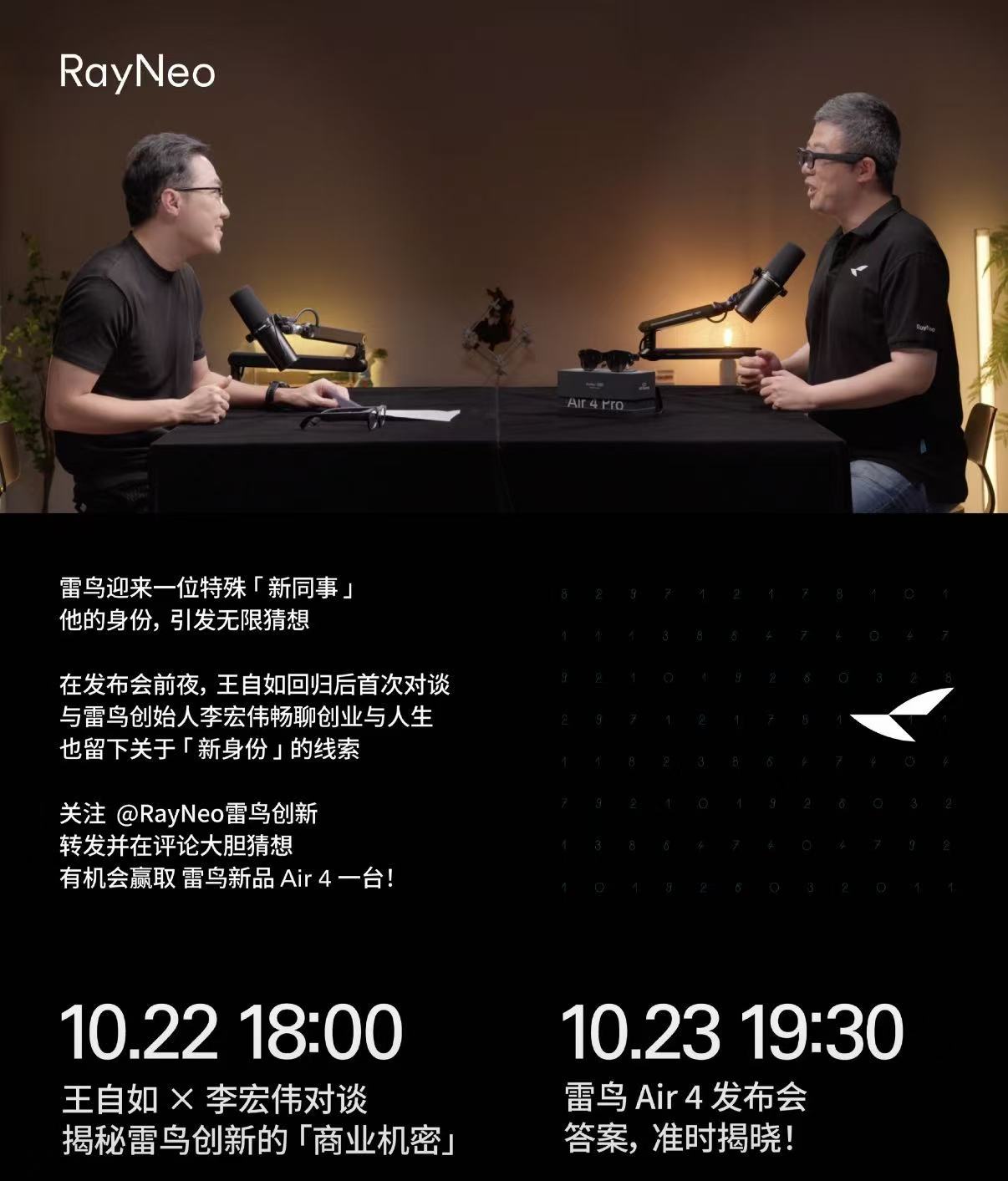 雷鸟创新还发布了一张宣传海报,透露王自如将与公司创始人进行一场深度对话。这一消息引发了网友的热议,有人戏称王自如这是要效仿罗永浩,涉足对话类播客领域。