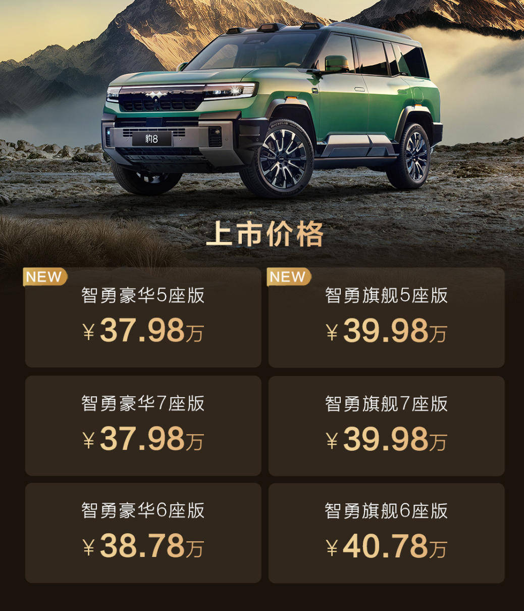 方程豹品牌旗下豹8大五座版近日正式登陆市场,此次共推出两款配置车型,售价区间锁定在37.98万元至39.98万元之间。新车在智能驾驶系统方面实现全面升级,全系标配华为乾崑智驾ADS 4.0系统,并特别推出湖光绿全新外观配色,为消费者带来更多个性化选择。