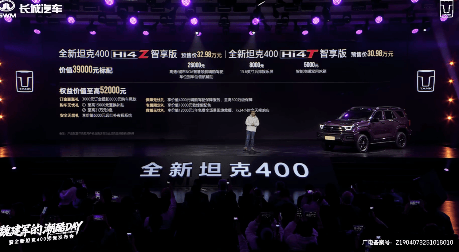 备受关注的新款坦克400(官方命名为“全新坦克400”)正式启动预售,此次预售共推出Hi4-Z智享版和Hi4-T智享版两款配置车型,预售价分别为32.98万元和30.98万元。作为中期改款车型,新车在外观细节和科技配置上进行了显著升级,为消费者带来更多选择。