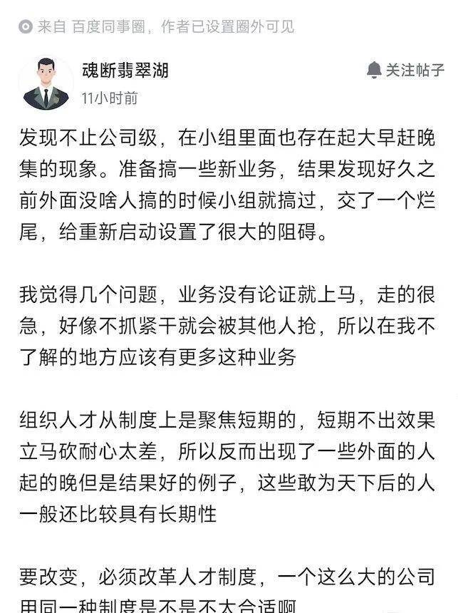 近日,一位自称百度员工的网友在匿名职场社区脉脉上发布长文,直指公司内部存在业务规划混乱与人才管理短视的双重困境。该帖子引发行业热议,众多互联网从业者参与讨论。