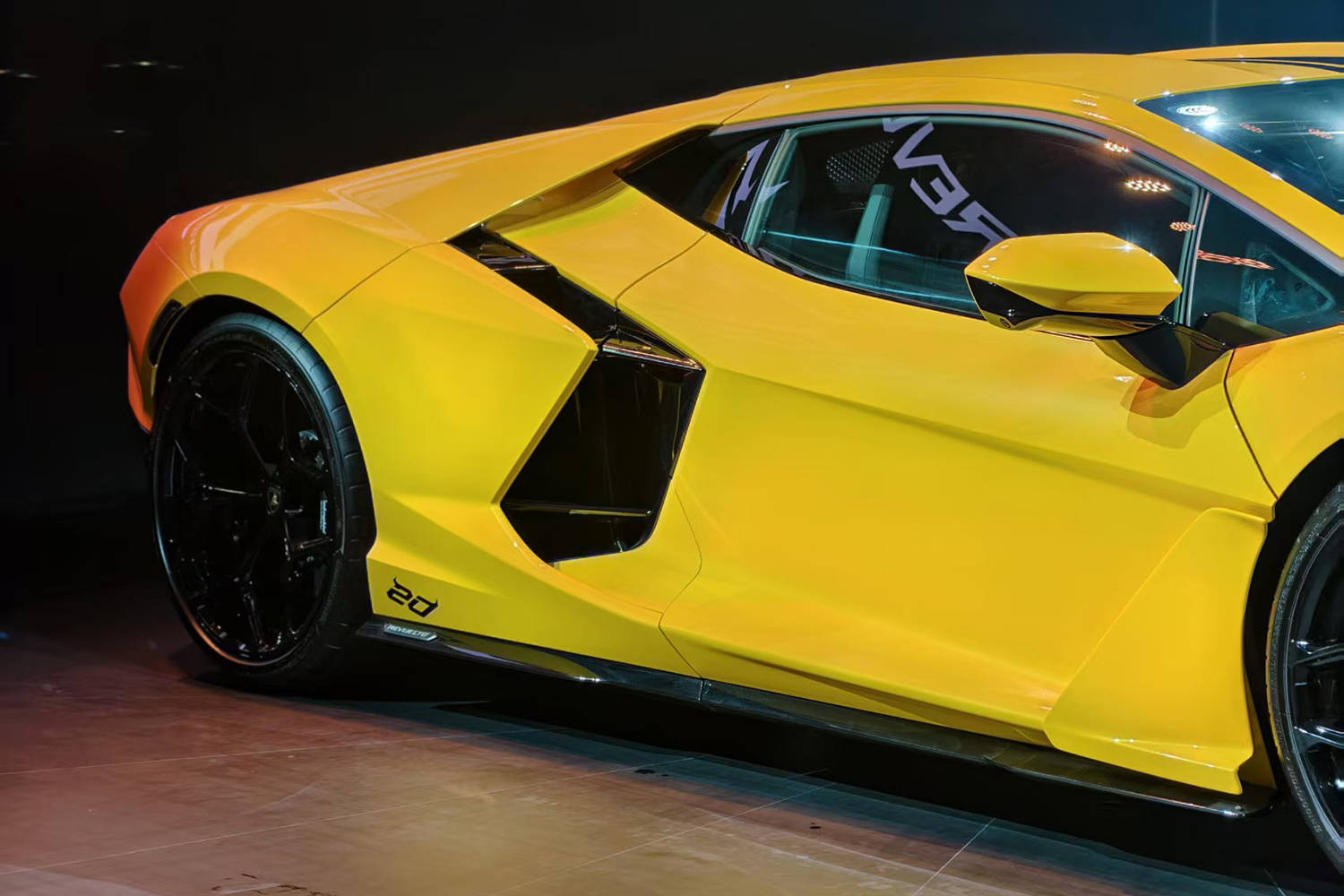 车身侧面最引人注目的当属标志性的剪刀门设计,配合传承自Diablo车型的悬浮式翼子板锋片,展现出独特的空气动力学美学。侧裙位置镶嵌的"20"专属标识,彰显着这款特别版车型的独特身份。轮毂系统采用前20英寸、后21英寸的超大尺寸规格,碳陶刹车系统配备前10活塞/后4活塞卡钳与410毫米超大刹车盘,性能配置堪称顶级。