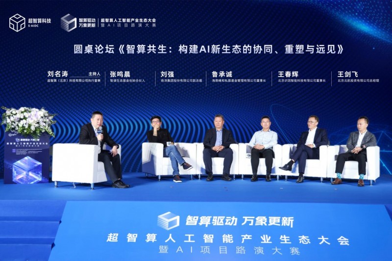 圆桌论坛环节,超智算科技执行董事刘名涛主持开展了以《智算共生:构建AI新生态的协同、重塑与远见》的讨论,与北京北航投资有限公司总经理王剑飞、商汤集团股份有限公司副总裁刘强、峰和资本董事长鲁承诚、智谱生态基金创始合伙人张鸣晨、北京识因智能科技有限公司董事长王春辉围绕“算力如何驱动产业创新”“AI技术商业化路径”及“生态构建的关键要素”等核心议题展开深度对话,观点交锋。