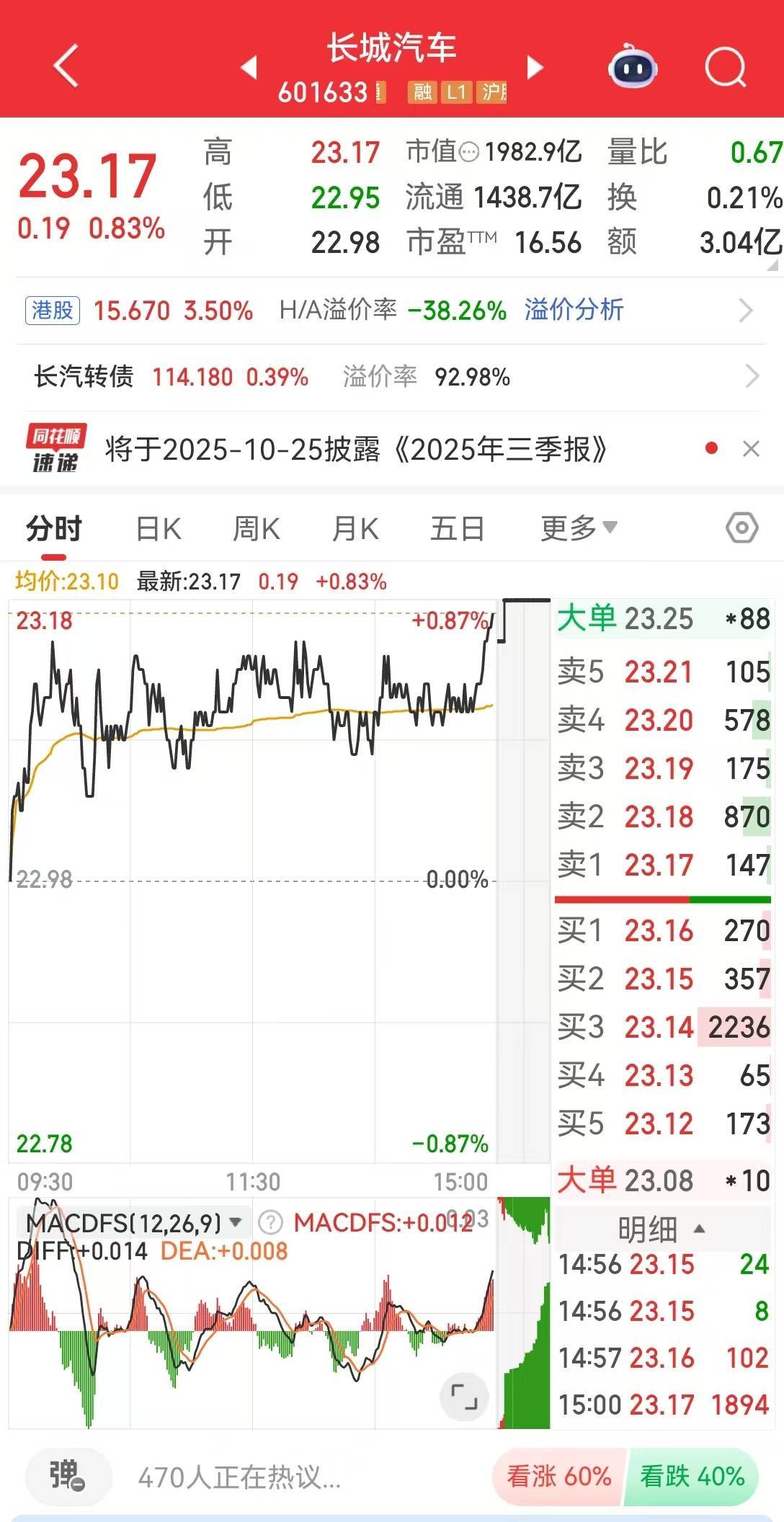 在资本市场方面,长城汽车同样表现出色。截至10月21日收盘,长城汽车股价报23.17元,当日涨幅0.83%,市值达到1982.9亿元。这一成绩不仅反映了市场对长城汽车未来发展的信心,也体现了其在行业中的领先地位与强大竞争力。