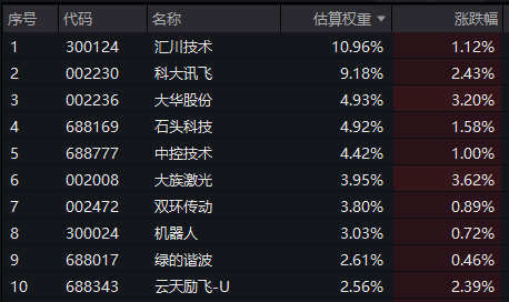 该基金标的指数成分股呈现普涨格局。大华股份、大族激光涨幅均超3%,云天励飞、科大讯飞上涨超2%,汇川技术、石头科技等个股涨幅超过1%。双环传动、机器人等标的股也位居涨幅前列,显示出板块整体强劲的上涨动能。