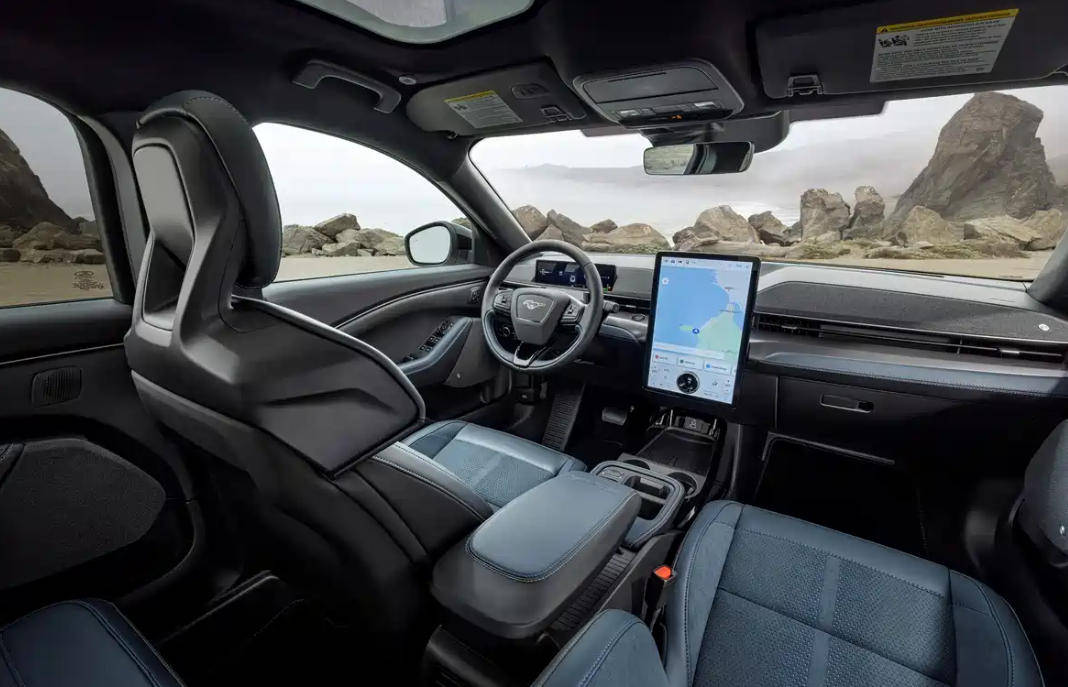 外观升级是本次特别版的核心亮点。车头采用三维立体式格栅设计,中央镶嵌蓝色野马徽标,与前舱盖的落日余晖主题拉花形成视觉呼应。专属标识"California Special"以镀铬工艺呈现于发动机盖两侧,搭配全新设计的双色轮毂,其辐条间嵌入的GT/CS缩写彰显独特身份。制动系统升级为Brembo高性能卡钳,配合车门处的Mach-E 4蓝色徽章,进一步强化运动属性。车尾部分,GT尾标内部同样嵌入California Special标识,形成前后呼应的设计语言。