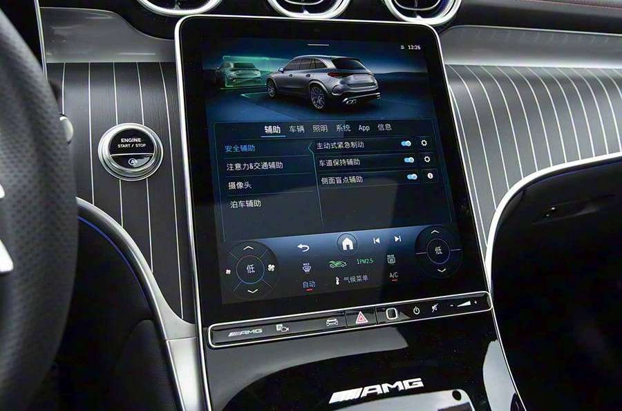 内饰布局在保留AMG运动基因的同时,注重科技感与实用性的平衡。Nappa皮质包裹的双翼式方向盘集成多功能操控单元,11.9英寸中控屏与12.3英寸仪表屏组成双联屏系统,搭载MBUX智能车机,支持CarPlay及Android Auto互联。智能驾驶辅助方面,全车配备12个超声波雷达,提供透明底盘与540度全景影像功能,L2级辅助驾驶系统列为可选配置。