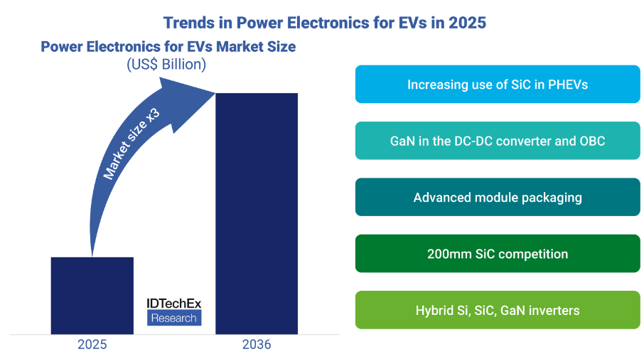 IDTechEx最新研究报告显示,2025年将成为电力电子行业的关键转折点。尽管全球纯电动汽车(BEV)销量增速有所放缓,但电动汽车电力电子市场仍将在2036年实现三倍增长,市场规模预计达到420亿美元。这一增长主要得益于插电式混合动力汽车(PHEV)对碳化硅(SiC)功率器件需求的持续攀升,以及氮化镓(GaN)技术在车载充电系统中的突破性应用。