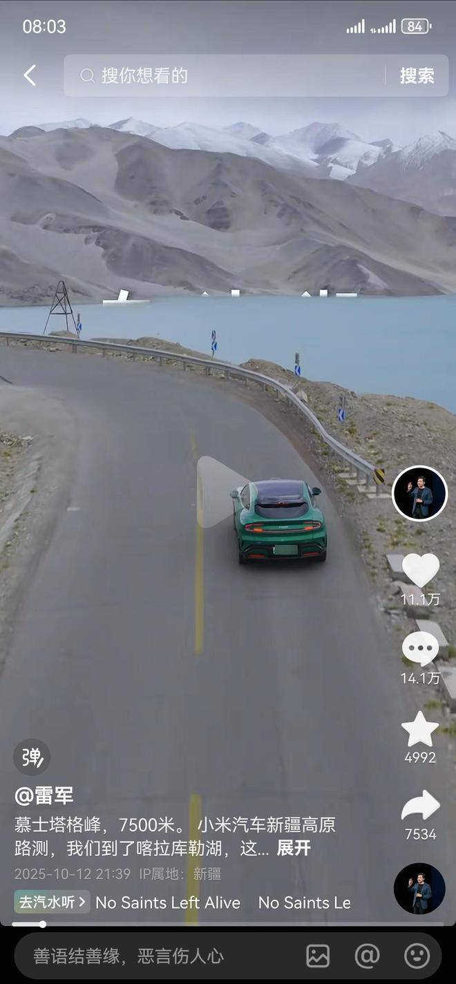 翻看该账号过往内容,最新一条视频发布于10月12日晚,内容聚焦小米在新疆地区开展的路测活动。而在断更之前,雷军抖音账号的短视频更新频率较为稳定,平均每两天就会发布一条新内容。