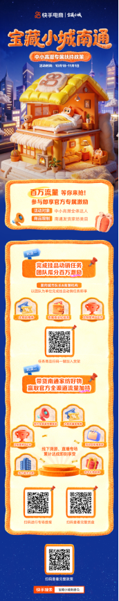此外,货架型商家将有机会获得百万曝光活动会场资源、商城大牌大补补贴等多维支持,实现强势曝光和高效转化。而短视频型商家带指定话题#宝藏小城南通,发布预约指定直播大场、挂链指定货盘短视频,则可获得粉条激励、流量加码,从短直双域实现声量与销量双丰收。