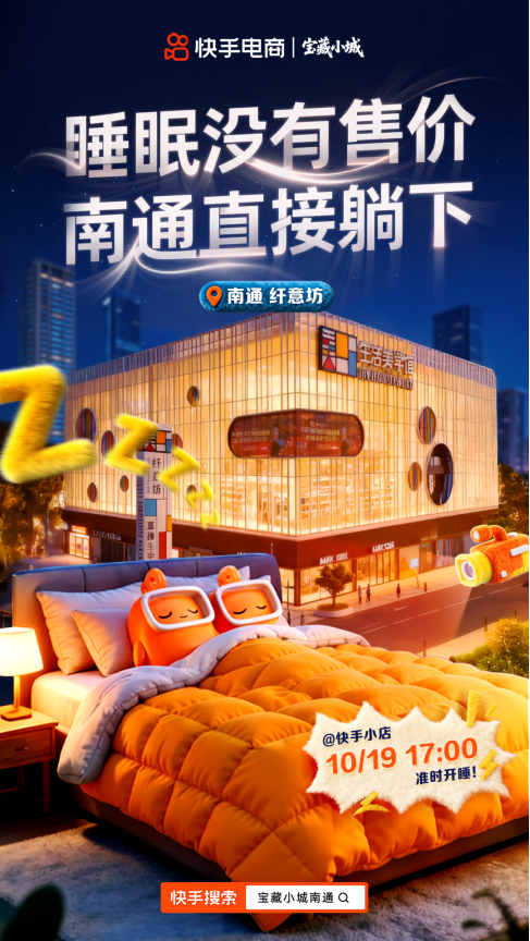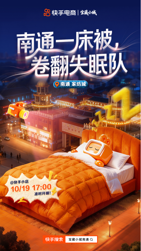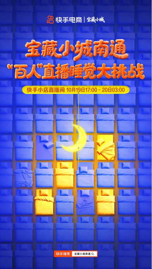 此次活动期间,为打造线上线下的多重声量,10月19日,快手电商将在南通家纺城“百人”直播睡觉大挑战,并在快手小店快手号同步直播,借助趣味策划活动,吸引用户关注南通家纺百货,牵引用户的下单消费。