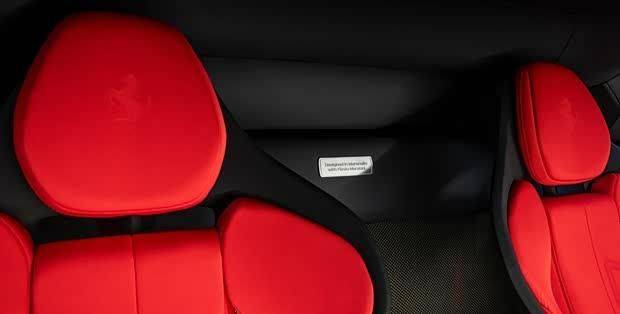 内饰设计延续了经典与现代相结合的理念。脚踏区域、座椅靠背、仪表台和方向盘装饰件均采用碳-凯夫拉复合材料,这种曾在F40上用于实现极致轻量化的材质,如今以更先进的工艺重现。座椅采用红色提花织物与黑色Alcantara材质拼接,还原了F40简约绒面仪表板的运动风格,在细节处呼应了复古主题。从碳纤维材质到织物选择,每一处设计都体现了对经典与现代的平衡。