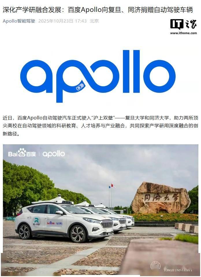 近日,国内自动驾驶领域迎来重要进展——百度Apollo自动驾驶车辆相继进入复旦大学、同济大学等顶尖高校,通过车辆捐赠、技术开放等形式,深度参与高校科研创新与人才培养体系建设。