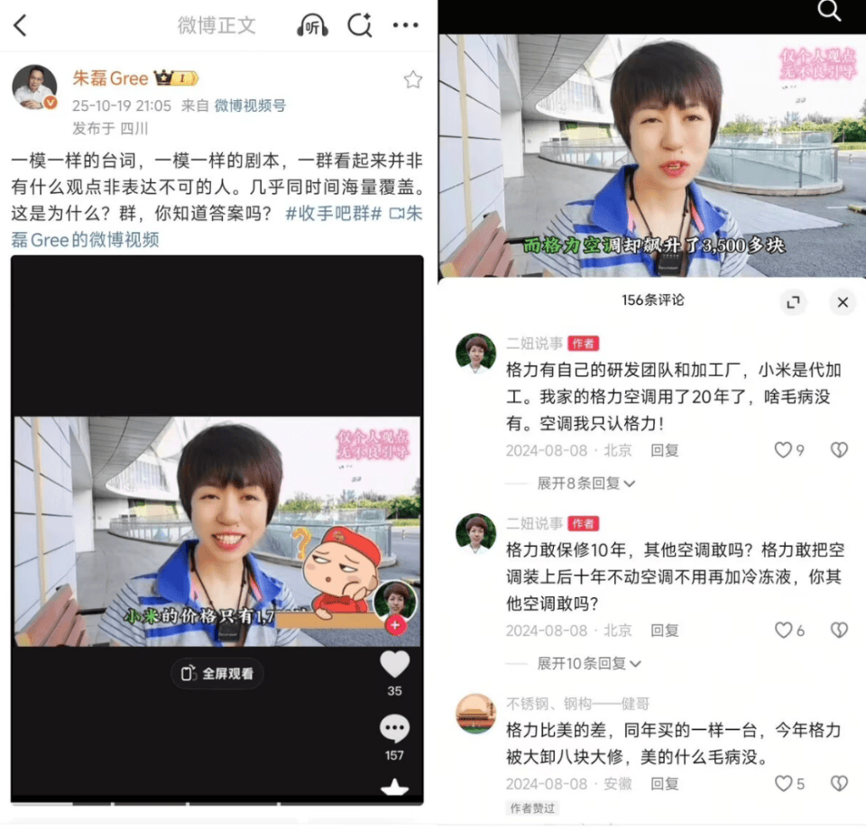然而,剧情很快出现反转。眼尖的网友发现,朱磊挂出的“黑公关”视频,实际是格力经销商或忠实粉丝自发创作的宣传内容。这些视频采用“欲扬先抑”的手法,先提及价格差异,再强调格力的品质优势,本质是为格力辩护。