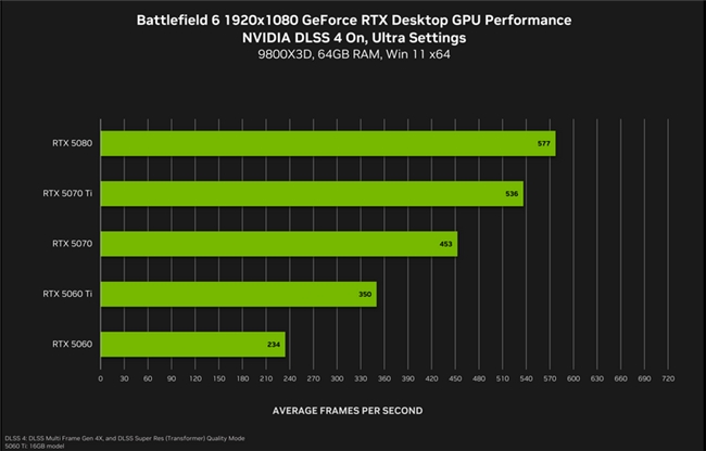 以上三款显卡均支持最新的NVIDIA DLSS 4技术,可以应用在包括《战地6》在内的数百款游戏内,在游戏中开启DLSS 4后,帧率可提升至原来的 3.8 倍,同时还支持NVIDIA Reflex技术,该技术可以显著改善显卡与键盘鼠标之间的操作延迟,让你在电竞对抗中更加灵敏和自如。