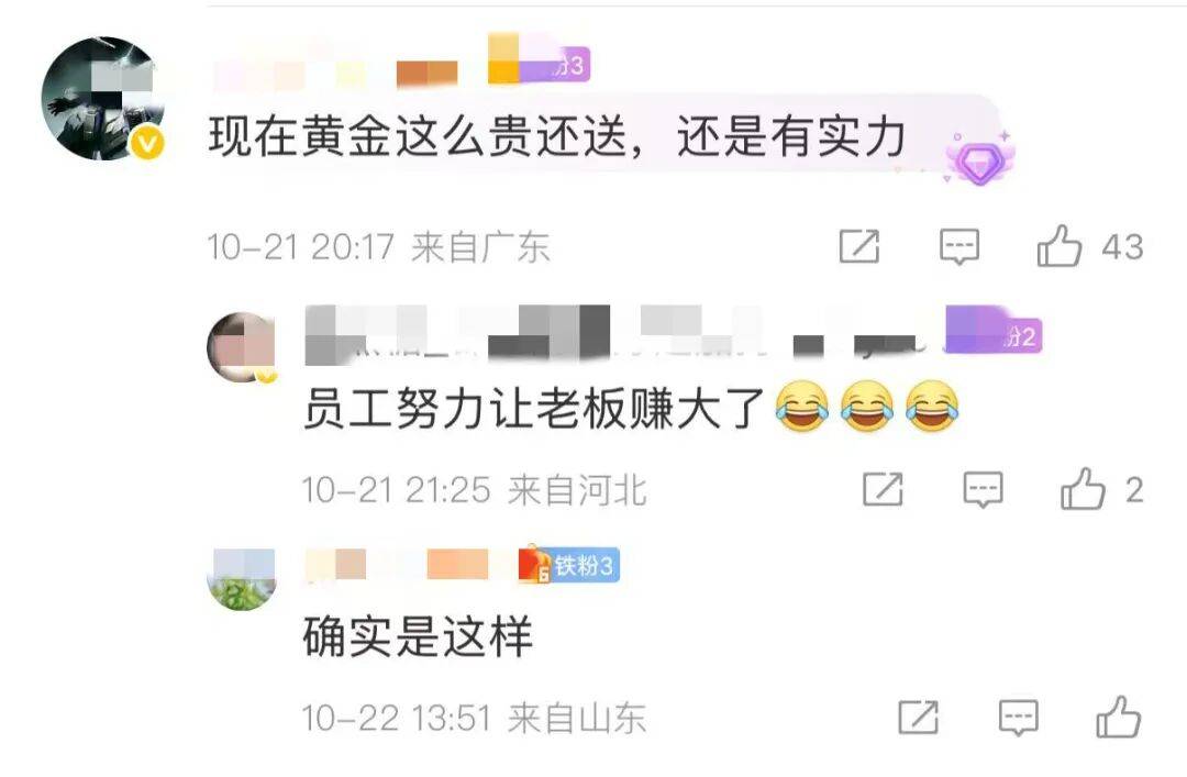 根据员工透露的信息,入职满3年的员工可获得约4克重的金戒指,满5年员工获赠11克金戒指,而入职满10年的资深员工则收到重达100克的“金鸡”黄金摆件。有员工在社交媒体上表示:“当前金价持续走高,公司仍坚持发放黄金礼品,这份福利确实很有诚意。”
