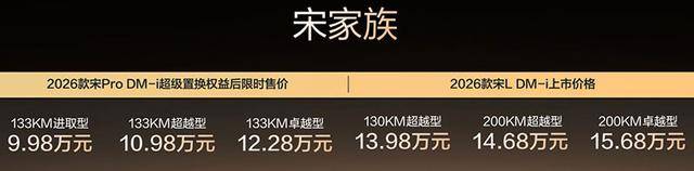 价格策略上,两款车型通过差异化定价覆盖更广用户群体。2026款宋L DM-i定价13.98-15.68万元,主打中级SUV市场;宋Pro DM-i在超级置换权益后限时售价下探至9.98-12.28万元,配合丰厚上市权益,实现“高价值”与“亲民价”的平衡。依托第五代DM技术及380万用户基础,宋家族双车此次焕新不仅强化了产品竞争力,更为中国家庭提供了经济、安全与智能兼具的出行解决方案。