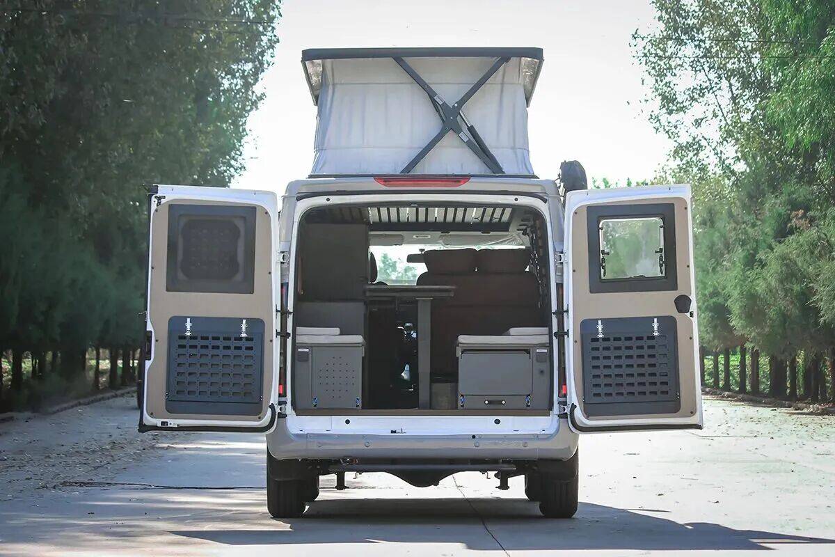 车内布局呈现双版本设计策略。标准旅居版配备可变卡座沙发,通过模块化设计实现用餐、办公、休息的多场景转换;而装载版则彻底取消传统座椅,打造出纵深达2.3米的纯平储物空间,可同时容纳两辆山地自行车或一台小型摩托车。这种"生活舱+装备库"的灵活切换,使其成为运动爱好者与长途旅行者的理想选择。