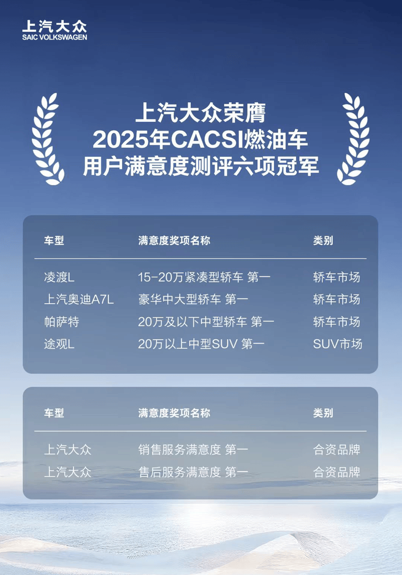 第八届汽车质量论坛暨2025年中国燃油汽车行业用户满意度指数(CACSI)测评结果近日在北京揭晓,上汽大众凭借产品与服务双线突破,一举斩获六项大奖。其中,大众品牌三款主力车型凌渡L、帕萨特、途观L及上汽奥迪A7L分获细分市场用户满意度冠军,大众品牌更在合资品牌销售服务与售后服务领域实现“双冠”加冕。