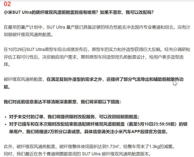 面对车主们的质疑,小米汽车于5月7日晚公开致歉,并提出了补偿方案。方案包括为未交付的订单提供限时改配服务,车主可选择改回铝制前舱盖;对于已提车和在限时改配结束前选配碳纤维双风道前舱盖的车主,赠送2万积分。然而,这一补偿方案并未得到车主们的认可。他们认为,2万积分的价值与4.2万元的选装费用相差甚远,且改配窗口时间有限,若不接受方案,2万元定金将被没收。