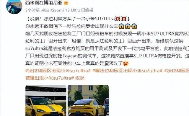 意大利马拉内罗法拉利工厂外,一辆带有小米标识的SU7 Ultra引发了广泛关注。据内部消息人士透露,这辆由法拉利官方采购的车辆,正被用于下一代纯电平台的研发测试。这一举动标志着传统超跑巨头在电动化转型中的关键动作,也折射出全球汽车产业格局的深刻变化。