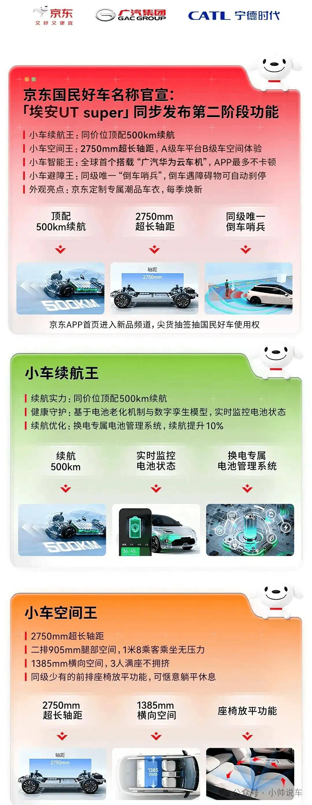 广汽集团联合京东与宁德时代,共同推出了一款全新纯电小型车——埃安UT super,这款车以“国民好车”为定位,不仅是一次产品创新,更预示着新时代出行方式的变革。