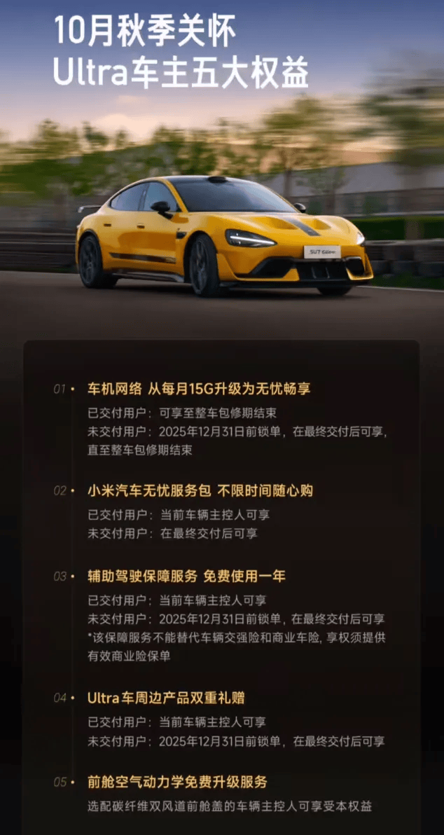 近日,小米汽车针对SU7 Ultra车型推出“10月秋季关怀”专项权益计划,为已交付及未交付用户提供涵盖网络服务、无忧保障、辅助驾驶、周边礼品及空气动力学升级在内的五大权益,覆盖车辆全生命周期。