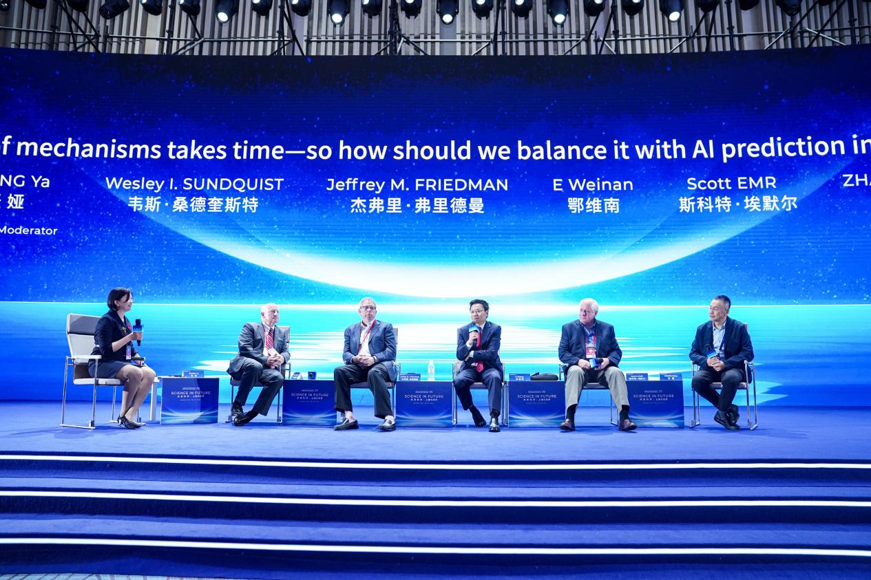 在主旨圆桌论坛中,鄂维南院士、杰弗里·弗里德曼(Jeffery Friedman)教授、韦斯·桑德奎斯特(Wesley I.Sundquist)教授、斯科特·埃默尔(Scott D.Emr)教授、张康教授围绕AI如何真正推进未来药物研发这一核心议题展开深度对话。五位顶尖科学家从科学数据的可信性、机制理解与AI预测的关系、如何规模化扩展等维度分享观点,对未来药物与治疗研发的核心挑战提出具有前瞻性的思考。圆桌论坛由上海交通大学人工智能学院副院长、医学人工智能研究院常务副院长张娅教授主持,现场思想激荡,金句频出,堪称一场高水平的学术思辨盛宴。