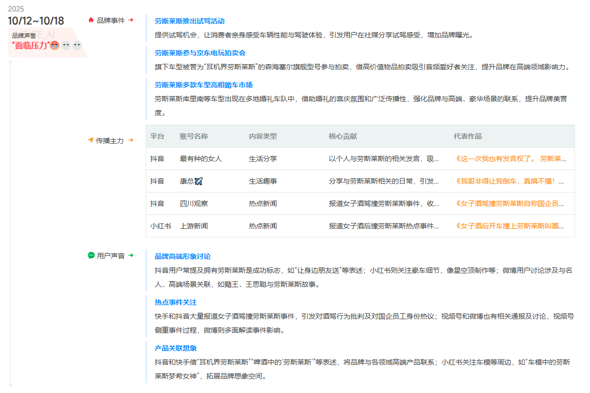 热点事件也进一步放大了品牌声量。例如,某女子酒驾撞劳斯莱斯的事件在快手、抖音引发大量报道,用户纷纷批判酒驾行为,并热议涉事者国企员工的身份;视频号和微博则从不同角度解读事件影响,视频号侧重事件过程还原,微博则聚焦社会讨论。
