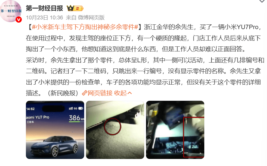 浙江义乌,一位新购小米YU7 Pro的车主在提车后发现车内存在异常部件,引发市场监管部门介入调查。据车主余先生反映,10月12日他花费30余万元购置了这辆新能源汽车,仅两天后便在更换脚垫时察觉主驾驶座椅下方有硬质凸起物。