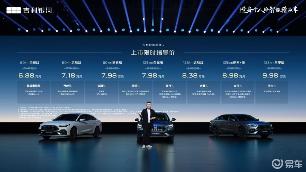 吉利银河全新主流电混家轿星耀6正式登陆市场,以“省钱、省心、舒心”三大核心价值重新定义国民家轿标准。新车推出7款配置版本,涵盖60km与125km两种纯电续航里程,官方限时指导价区间为6.88万元至9.98万元。即日起至11月30日下订并锁单的用户,可享6000元超级置换补贴及七重购车权益,包括金融方案、质保服务、智能流量等全周期保障。