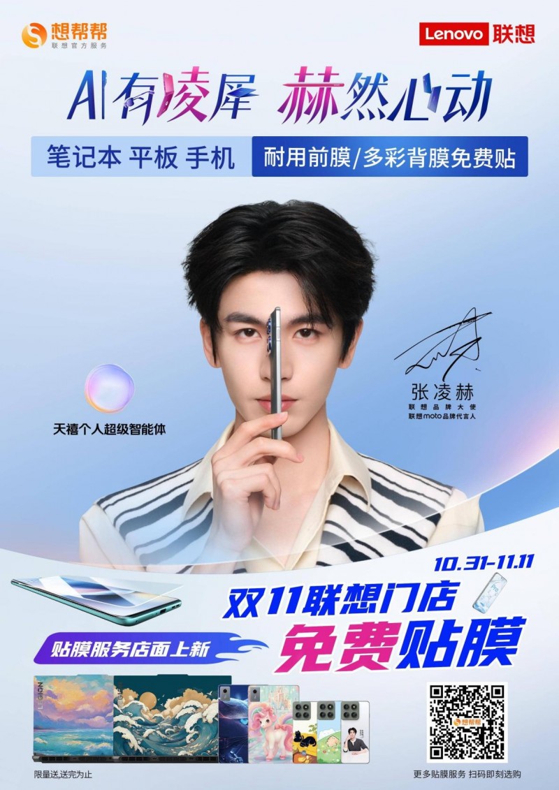 更有“联想品牌大使”张凌赫代言助阵,为本次贴膜活动带来更多诱人福利与视觉惊喜——限量张凌赫定制款贴膜已悄然到达门店,专为粉丝量身设计,不仅贴合屏幕保护爱机,更能贴进你的心动瞬间!“AI有凌犀,赫然心动”,不仅是一句口号,更是一份贴心服务的承诺。如果你也想给设备换个新颜,又不想在贴膜这件事上踩雷,那这个双十一,不妨直接锁定联想服务门店:贴得好看,也贴得安心。