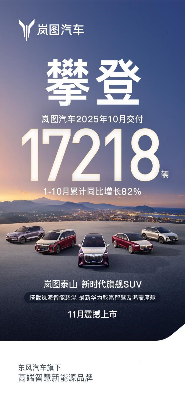 近日,岚图汽车公布了最新市场成绩,10月交付量达17218辆,创下单月历史新高。今年1-10月,该品牌累计交付量同比增长82%,连续九个月实现正增长,展现出强劲的发展动能。作为央企背景的高端新能源品牌,岚图正通过“产品+资本”双轮驱动战略,加速向30万辆产销目标迈进。