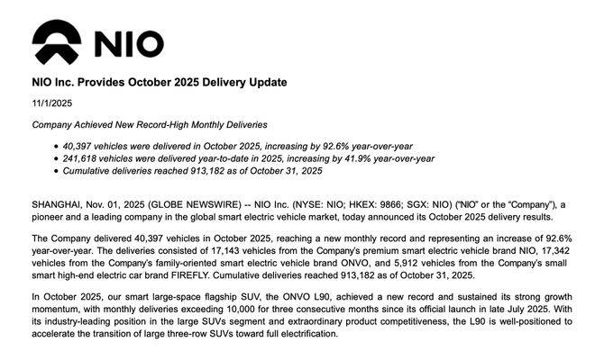 蔚来汽车今日公布了最新交付数据,以亮眼成绩刷新品牌纪录。2025年10月,公司单月汽车交付量突破4万辆大关,达到40397辆,较去年同期大幅增长92.6%,创下月度交付量历史新高。这一数据不仅展现了品牌强劲的市场竞争力,也为新能源汽车行业注入新的发展动能。