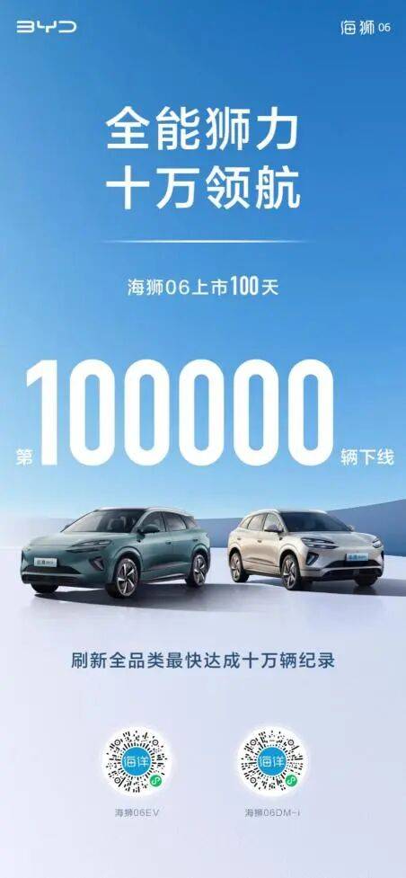 比亚迪海洋网旗下“高能超享SUV”海狮06迎来重要里程碑——上市仅百日,第十万辆整车正式下线。这一成绩不仅刷新了全品类车型突破十万辆的最快纪录,更以“海狮06速度”彰显其市场号召力,为主流SUV市场树立了新的价值标杆。