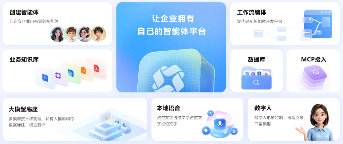 面向企业客户,覆盖各类智能应用场景:智能问答、公文写作、文档翻译、数字人、会议录音助手、深度研究报告、RPA微信机器人等。