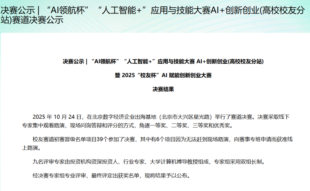 2025年10月29日,由中国互联网协会、北京大学软件与微电子学院、北京大兴经济开发区联合主办的“AI领航杯”人工智能+应用与技能大赛AI+创新创业(高校校友分站)暨2025“校友杯”AI赋能创新创业大赛在京圆满收官,获奖名单正式揭晓。一批代表“人工智能+”前沿方向的优秀项目脱颖而出,展现了AI技术赋能百业的巨大潜力与活力。