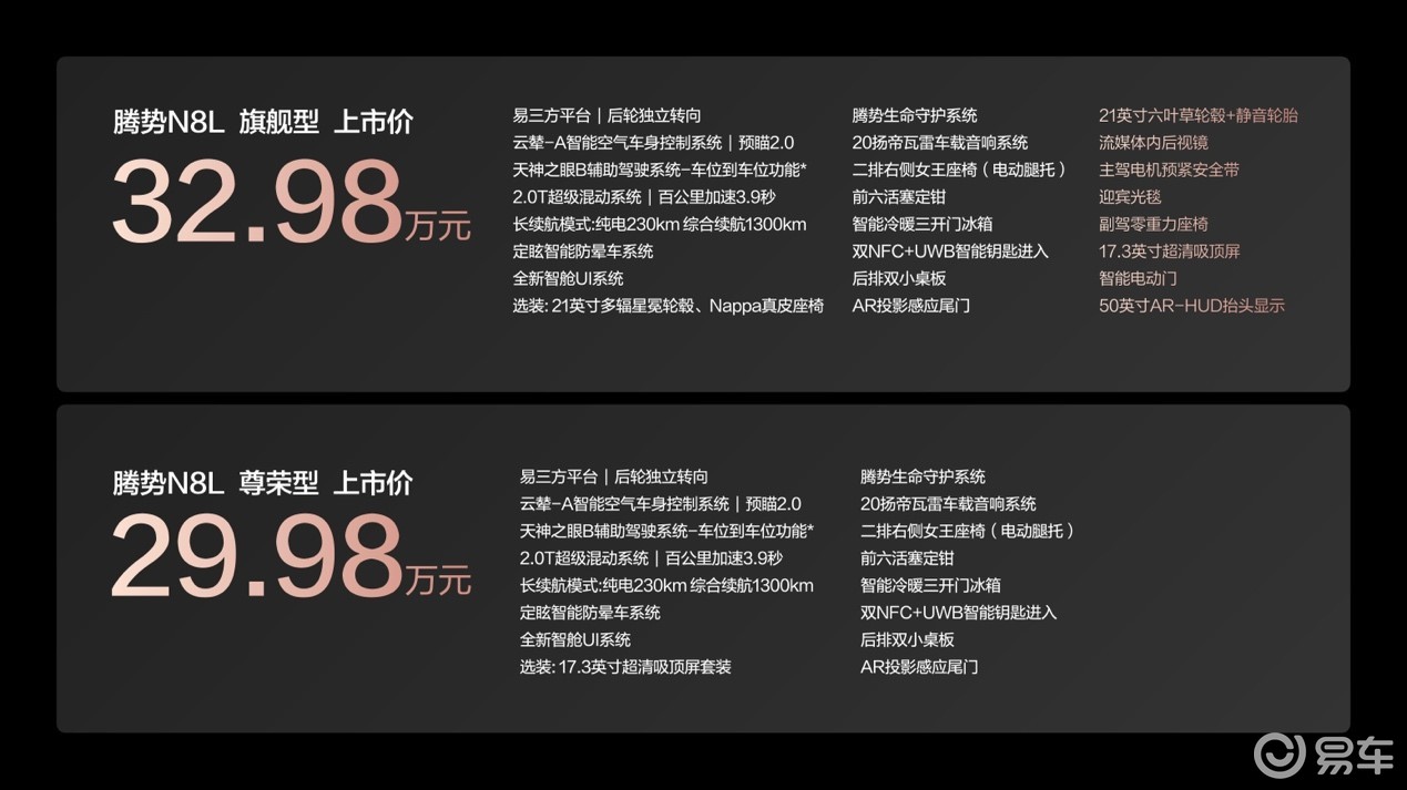 腾势汽车日前以“全维进化,悦享全家”为主题推出全新大六座安全豪华SUV——腾势N8L。这款专为多孩家庭打造的车型,以29.98万元起售价(城市尊荣型)和32.98万元(城市旗舰型)正式入市,较预售阶段直降2万元,直接瞄准中高端家庭SUV市场展开攻势。