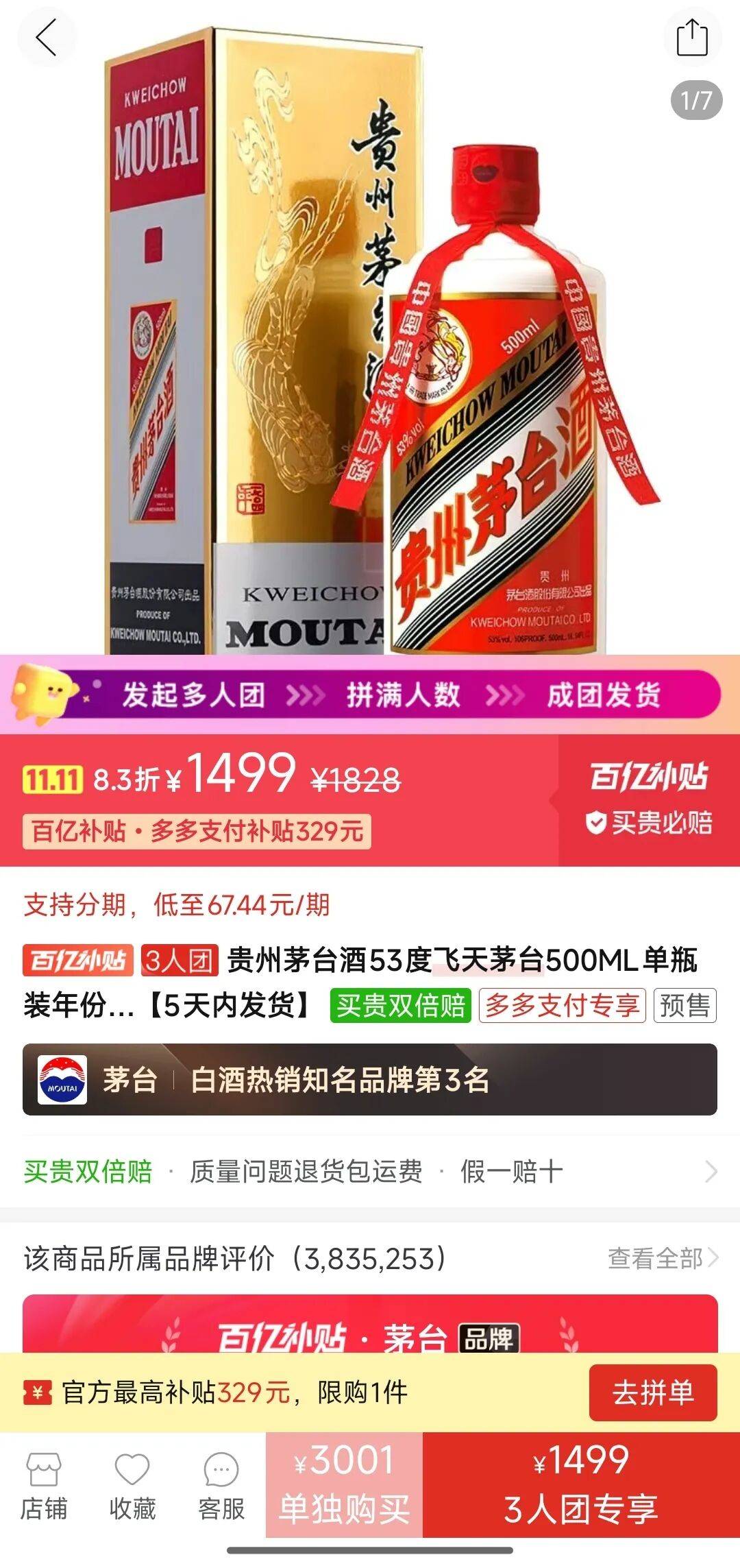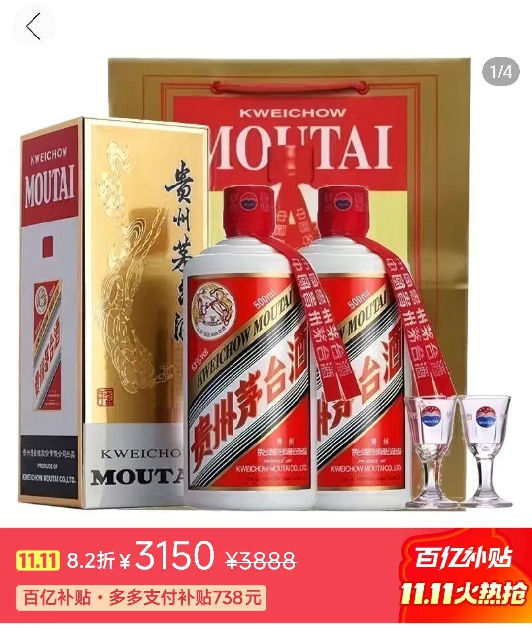 “双11”购物节期间,电商平台上的白酒价格成为消费者关注的焦点,其中53度飞天茅台的售价尤其引人注目。在拼多多平台上,这款知名白酒的价格出现了明显下调,双瓶装补贴后售价为3150元,折合每瓶约1575元;而单瓶三人成团价更是低至1499元。这些商品由多家酒类专营店运营,商家均承诺“100%正品,假一赔十”,并标注了“百亿补贴”的标识。其他品牌名酒的价格也在促销期间出现了小幅下降。