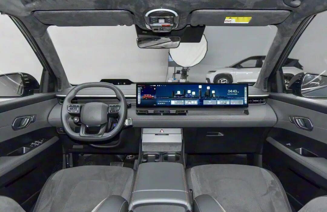 内饰空间展现高品质工艺。环抱式座舱提供灰绿与黑灰双色选择,大面积仿麂皮材质覆盖带来柔软触感。27英寸4K超薄宽幕显示屏集成高通骁龙8295芯片,支持全屏游戏和多APP应用,下方储物槽可容纳手机钱包等物品。赛博之眼前景显示系统突破传统HUD设计,不受环境光干扰且不遮挡视线。中岛区域配备双无线充电面板和水杯架,后排抽屉式储物格与B柱出风口设计凸显人性化考量。