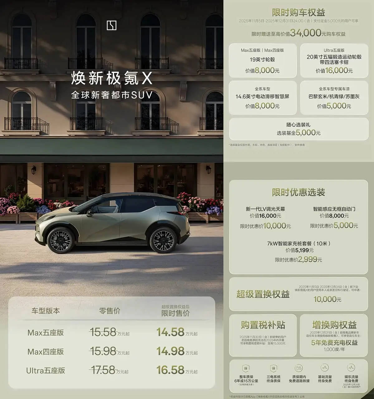 近日,极氪品牌旗下紧凑型SUV新款极氪X正式宣布上市,共推出三款不同配置车型,官方指导价区间为15.58万元至17.58万元。若享受超级置换权益,限时优惠后售价可降至14.58万元至16.58万元。在12月31日24:00前支付5000元定金的用户,还可获得至高价值34000元的购车权益礼包,其中包含5000元选装基金。