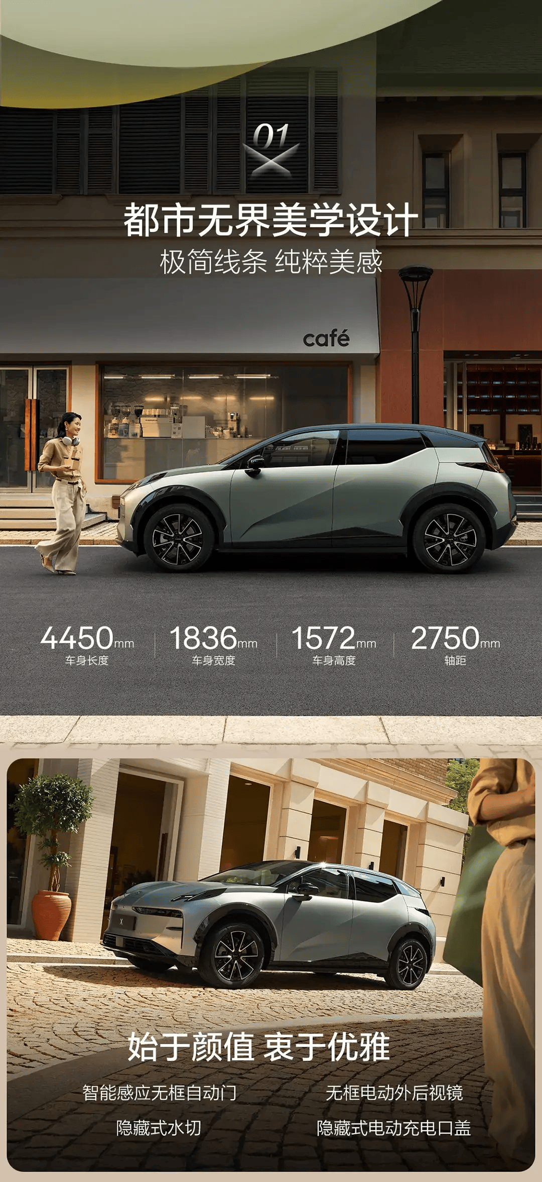 作为年度改款车型,新款极氪X在外观设计上延续了现有的极简风格,智能矩阵式LED大灯巧妙隐藏于前格栅中,扁平化的造型设计赋予整车强烈的未来感。车身尺寸方面,新车长宽高分别为4450mm、1836mm和1572mm,轴距达到2750mm,为车内空间提供了有力保障。配色方面,新车提供了巴黎玄米、苏墨灰、奥斯陆黑、加州霞粉、杭青绿和西雅图绿六种颜色供消费者选择。