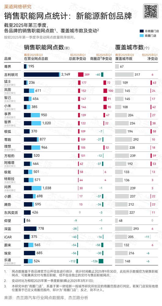 创新渠道形态成为竞争新焦点。吉利银河打造的"吉行驿"超市型分销网络,三季度已突破900家,通过与商超、社区的深度绑定,将购车场景嵌入日常生活。这种模式不仅降低运营成本,更精准触达家庭用户群体。猛士、岚图等品牌则通过产品迭代驱动渠道扩张,前者新增236家网点覆盖177个城市,后者借力新车密集上市实现152家终端增量。