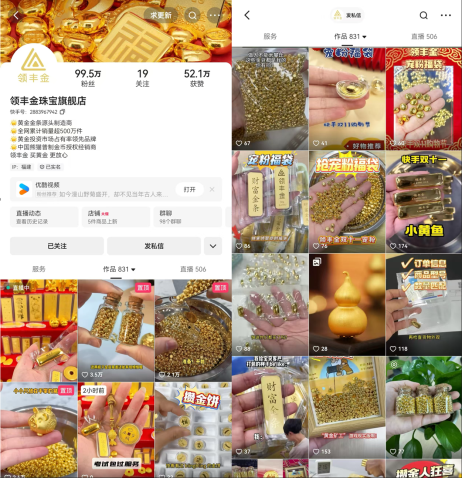 以多元内容布局实现全域流量触达,是品牌拉新种草的有效手段。入局初期,领丰金在内容质量、创意角度等方面持续发力,打造“买黄金后如何辨别真假”、“工厂溯源”、“沉浸式切金条”等海量优质短视频内容,将金价趋势、科普干货、热门爆梗与产品卖点巧妙结合,为品牌带来精准曝光。