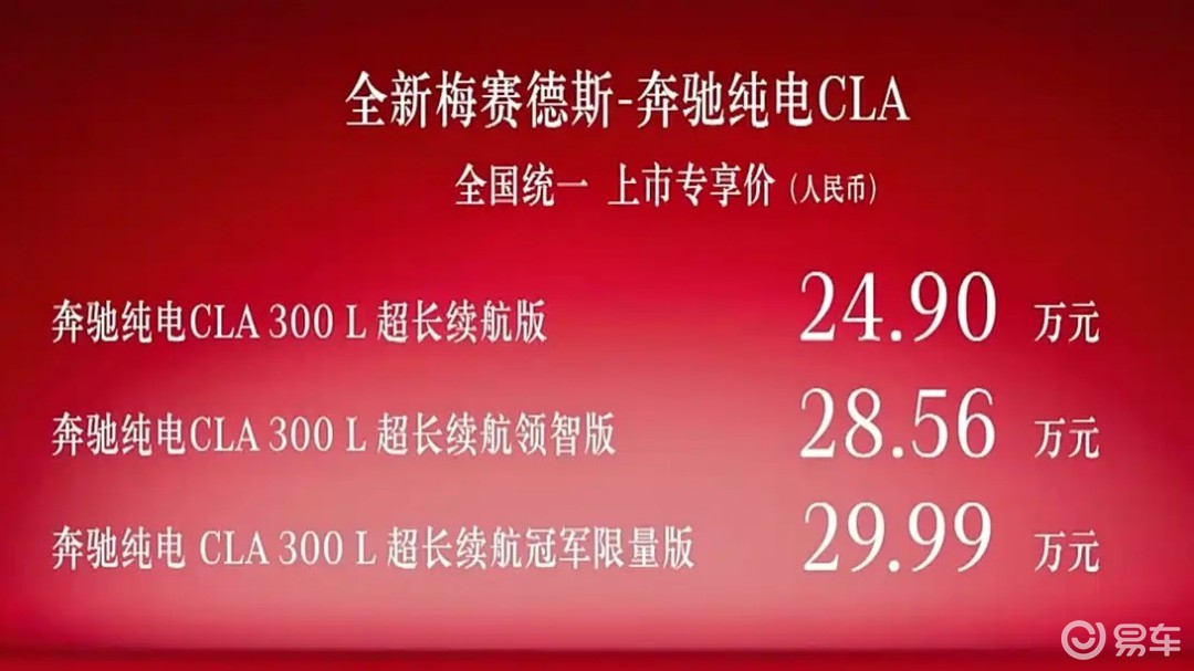 梅赛德斯-奔驰全新纯电CLA近日正式登陆中国市场,推出三款配置车型,官方指导价区间为24.9万至29.99万元。作为基于MMA纯电平台打造的首款量产车,新车通过866公里超长续航、11安全气囊标配以及L2+级智能驾驶系统,展现出豪华品牌在电动化领域的深度布局。这款专为中国市场优化的车型,在空间、舒适性及智能化方面进行了多项本土化升级。